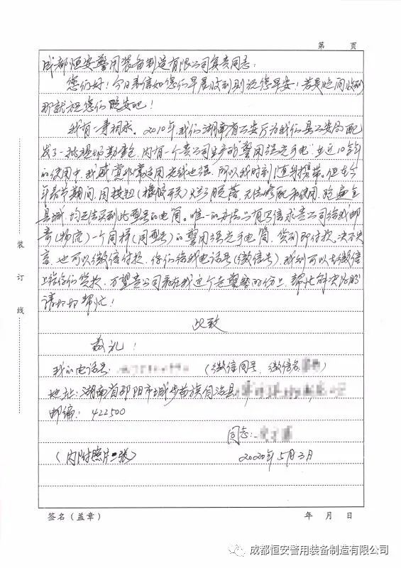 最让人感动是2020年5月6日,成都恒安企业负责人收到一封来自湖南一线民警寄来的一封来信。