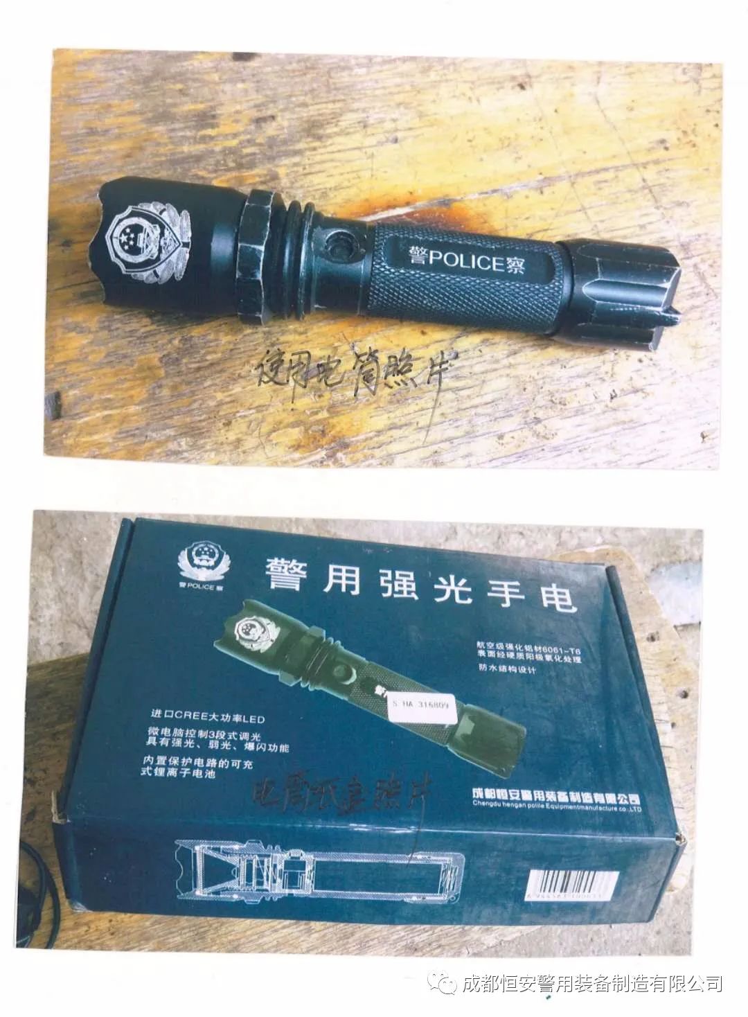 在2010年湖南省公安厅向我司采购了一批装备,配发到全省民警,这位来信民警说装备中的单警强光手电,十年间不管是现场勘查、还是日常巡逻、还是平常出警他一直随身携带,十年的使用中他感觉非常好用,十年间光照强度从没有减弱过,各种功能也没随时间的推移而发生任何故障。今年春节不小心将这只手电上的开关键弄掉了,来信希望向我司再购买一把一样的强光手电,但又舍不得丢掉这只旧的警用强光手电,表示把小开关修好还可以用多年........